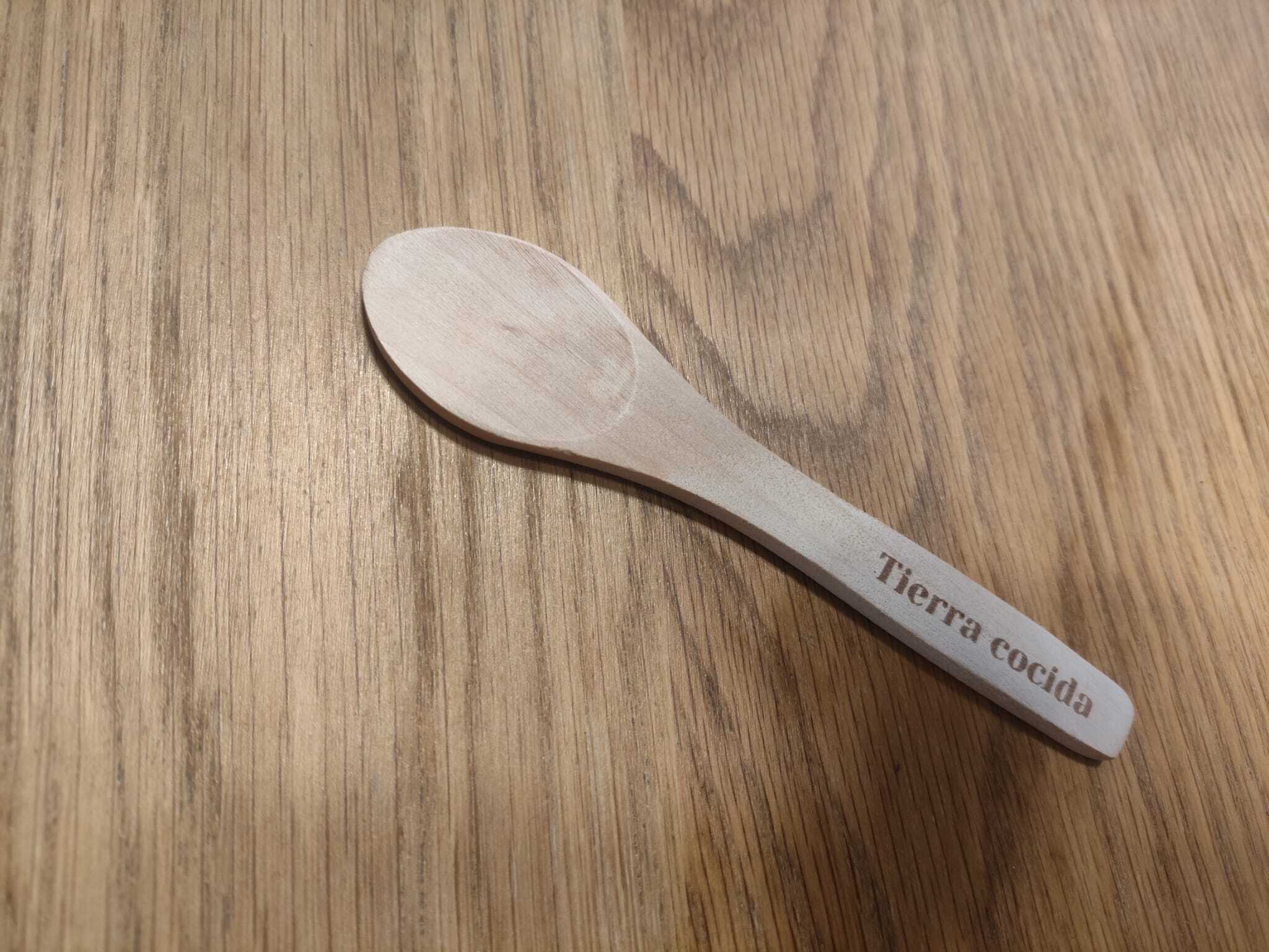 Łyżeczka wykonana w 100% z drewna, z napisem wypalonym "Tierra cocida" - firmą odpowiedzialną za nasze miski ceramiczne.