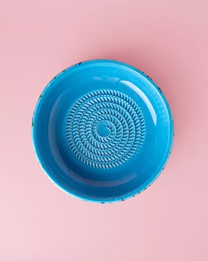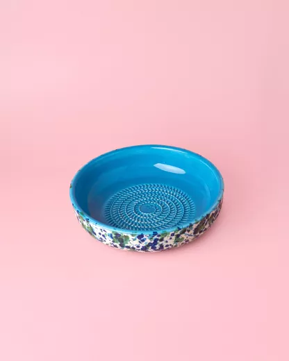 Miseczka ceramiczna z tarką w środku, kolorowa, ręcznie wykonana, z Hiszpanii, idealna do ścierania warzyw i owoców.