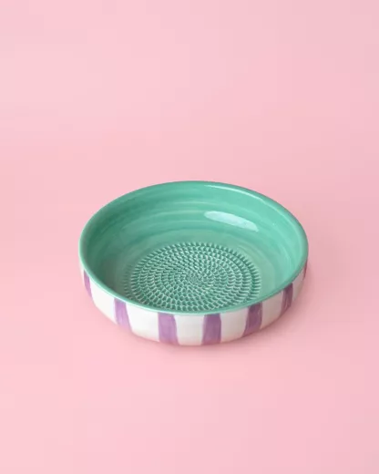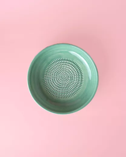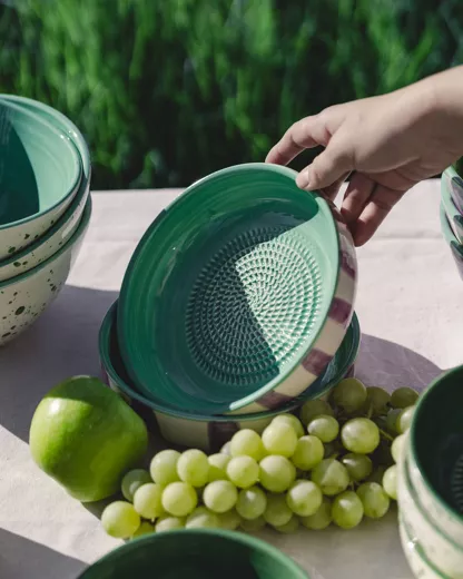 Miseczka ceramiczna z tarką w środku, kolorowa, ręcznie wykonana, z Hiszpanii, idealna do ścierania warzyw i owoców.