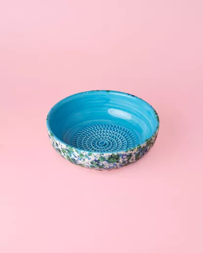 Miseczka ceramiczna z tarką w środku, kolorowa, ręcznie wykonana, z Hiszpanii, idealna do ścierania warzyw i owoców.